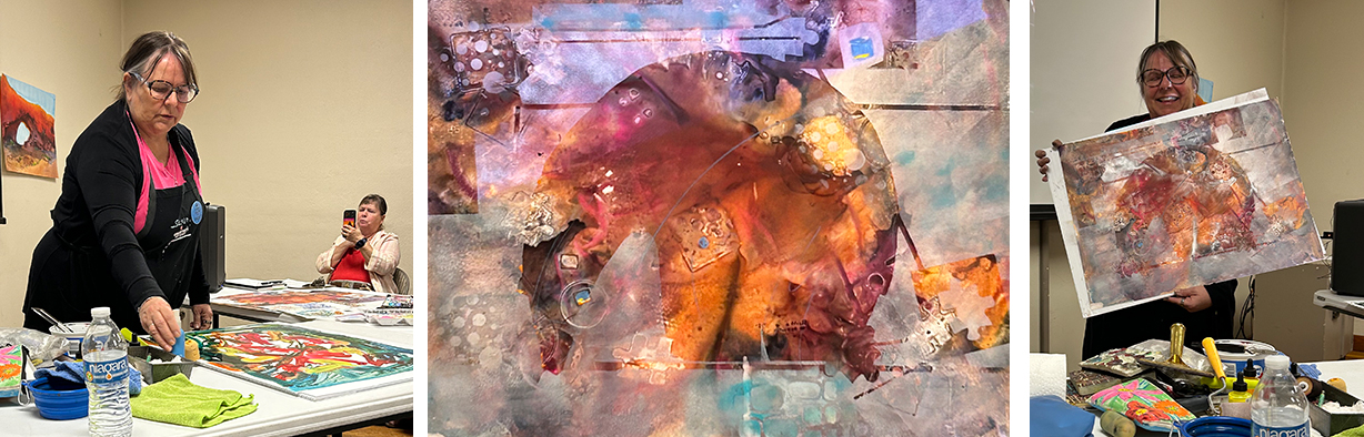 What a fun, informative presentation by award winning, watercolor artist, Susan Seaborn at our January GVAL Meeting! She demonstrated watercolor on Yupo, rather than on watercolor paper. Her art is playful and uses many different tools… pastry cutters, tapes, homemade Yupo stencils, printing, tissues, watercolor crayons and more. Susan’s artwork is full of vibrant color and joy.
