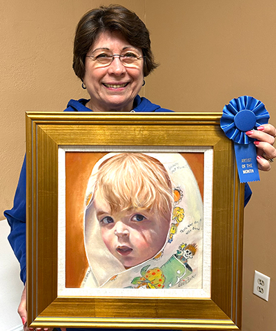 She was chosen by our art league members as January GVAL Artist of the Month. Her 12 X 12 oil painting is titled “The Blankie”.